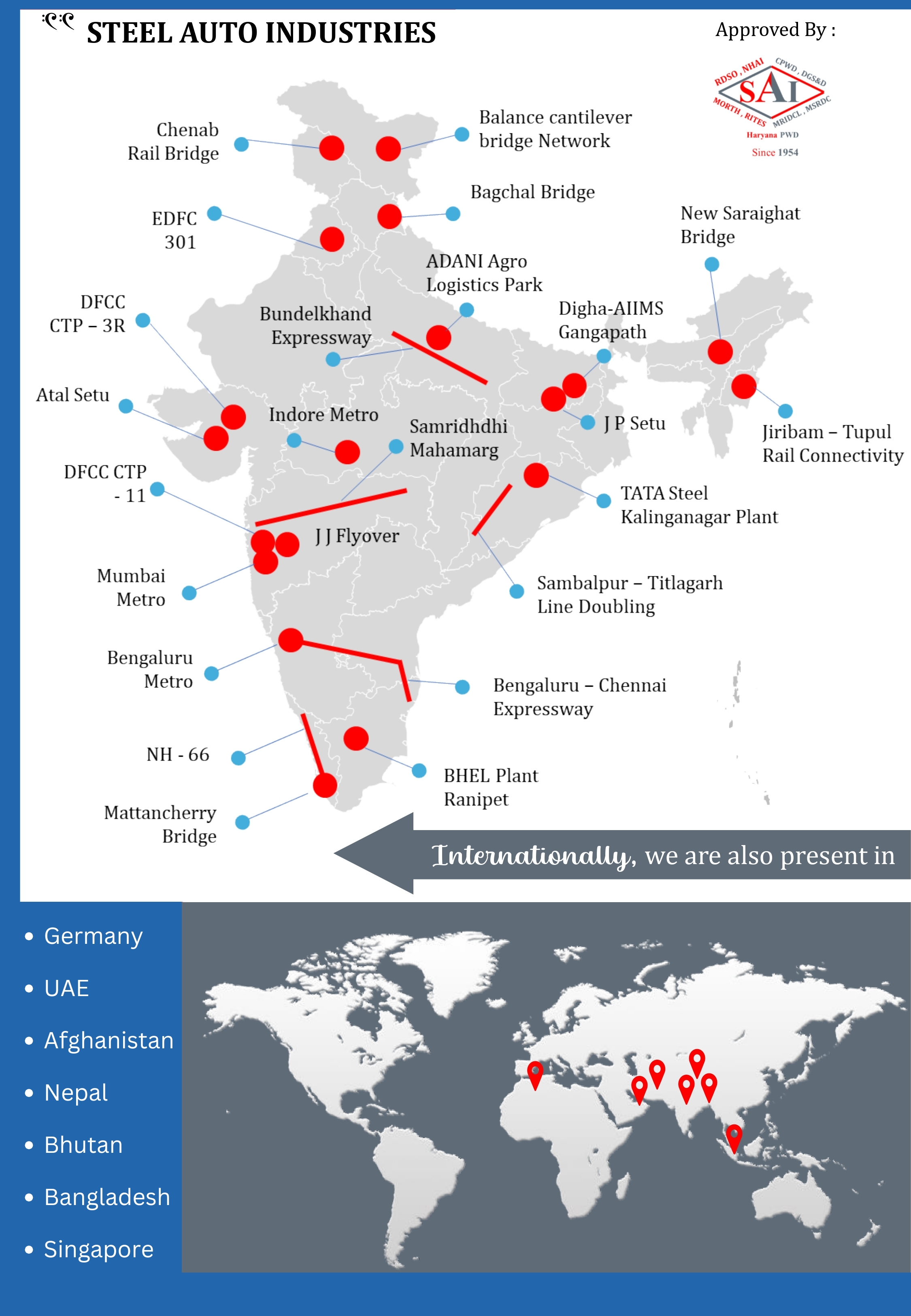 In INDIA Steel Auto Industries (SAI) is a leading name for Specialized Bridge products for more than 7 decades now. In recent past, SAI is also a prominent exporter to the Middle East, Indian Sub-continent and Europe.